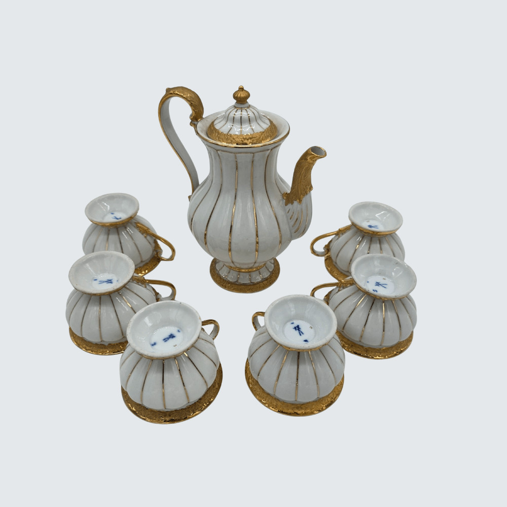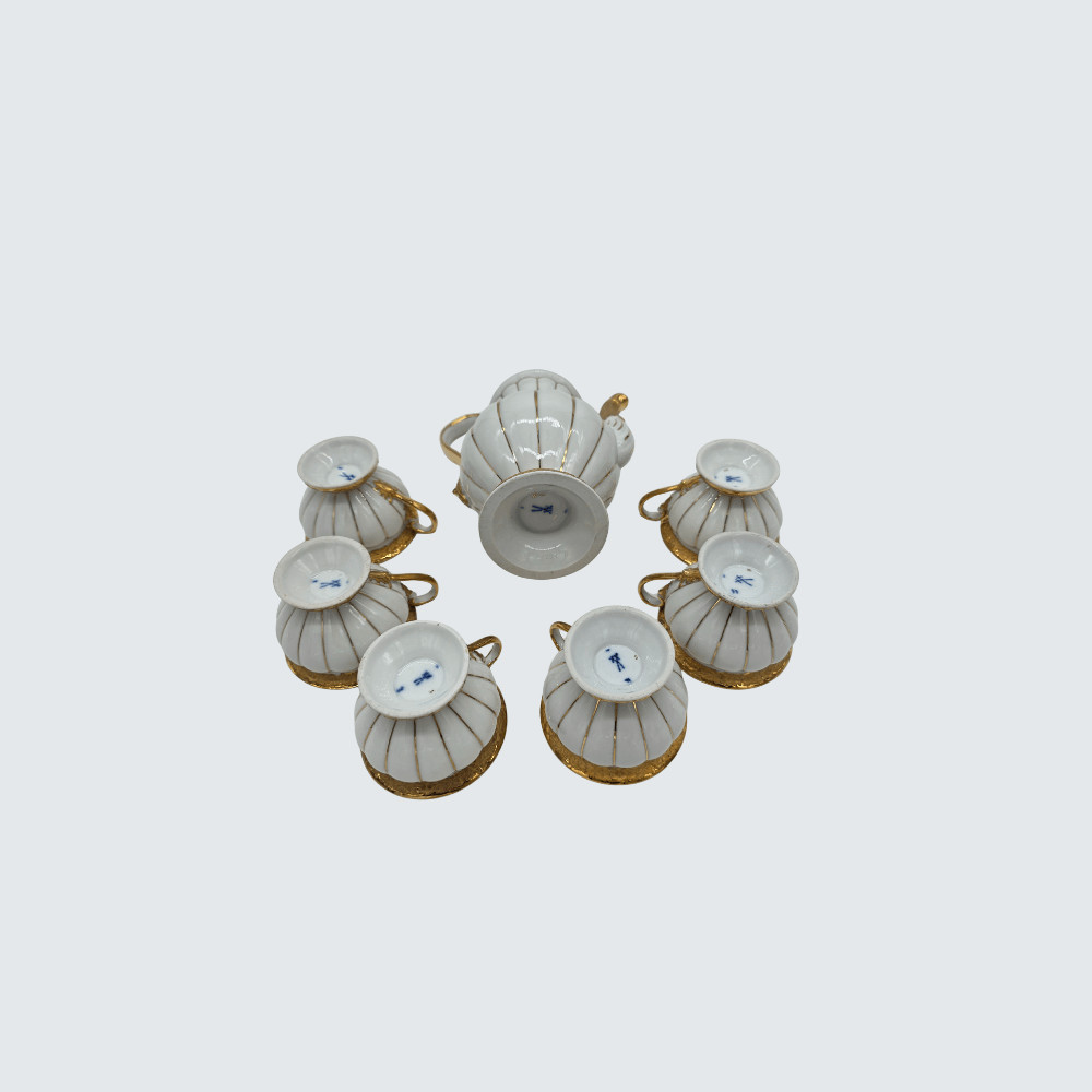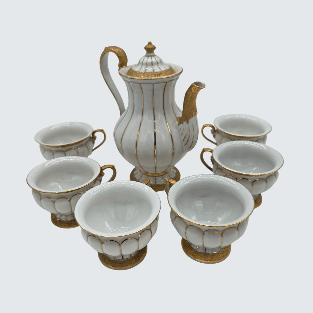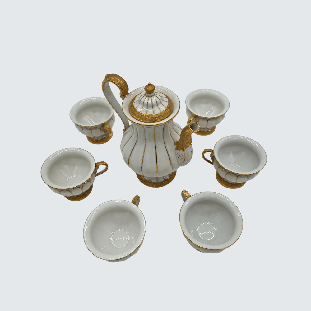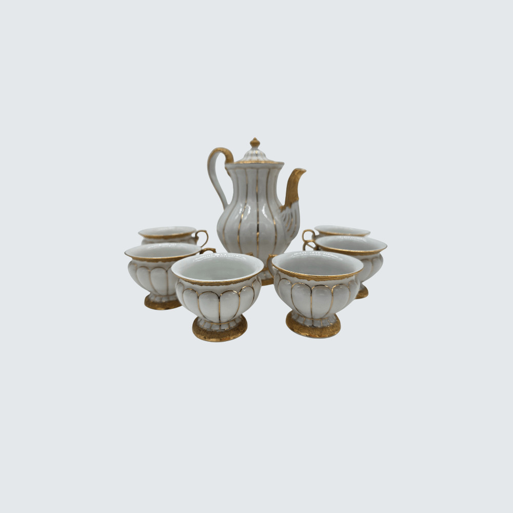 Fehér és aranyozott porcelán mokkás készlet – 6 csésze és kiöntő